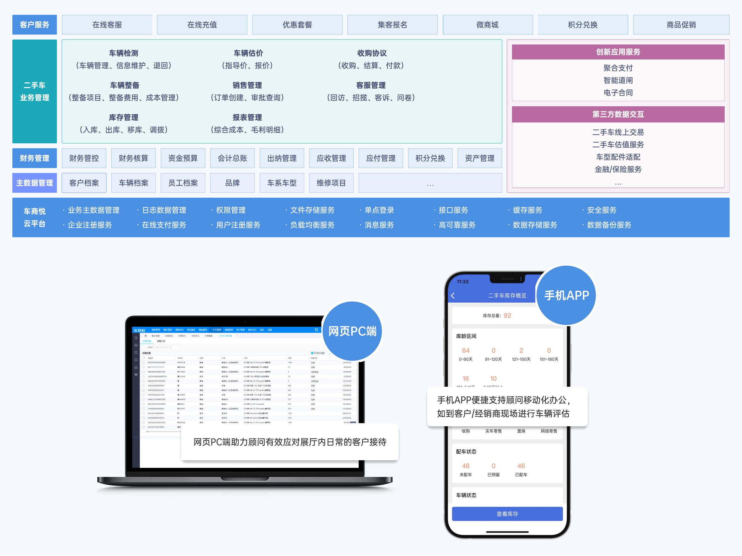 面向二手車(chē)商、汽車(chē)經(jīng)銷(xiāo)商,構(gòu)建以核心業(yè)務(wù)為基礎(chǔ)的二手車(chē)運(yùn)營(yíng)服務(wù)平臺(tái),實(shí)現(xiàn)車(chē)輛檢測(cè)、評(píng)估、收購(gòu)、整備、庫(kù)存、銷(xiāo)售與客戶服務(wù)的規(guī)范化、流程化管理,有效提升管理效率與客戶體驗(yàn)。
